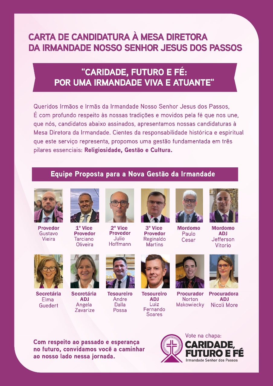 A Irmandade do Senhor Jesus dos Passos tem sido um pilar de fé e caridade em Florianópolis. É com grande respeito por essa tradição que nos apresentamos como Chapa 1: Irmandade Senhor Jesus dos Passos – Caridade, Futuro e Fé.